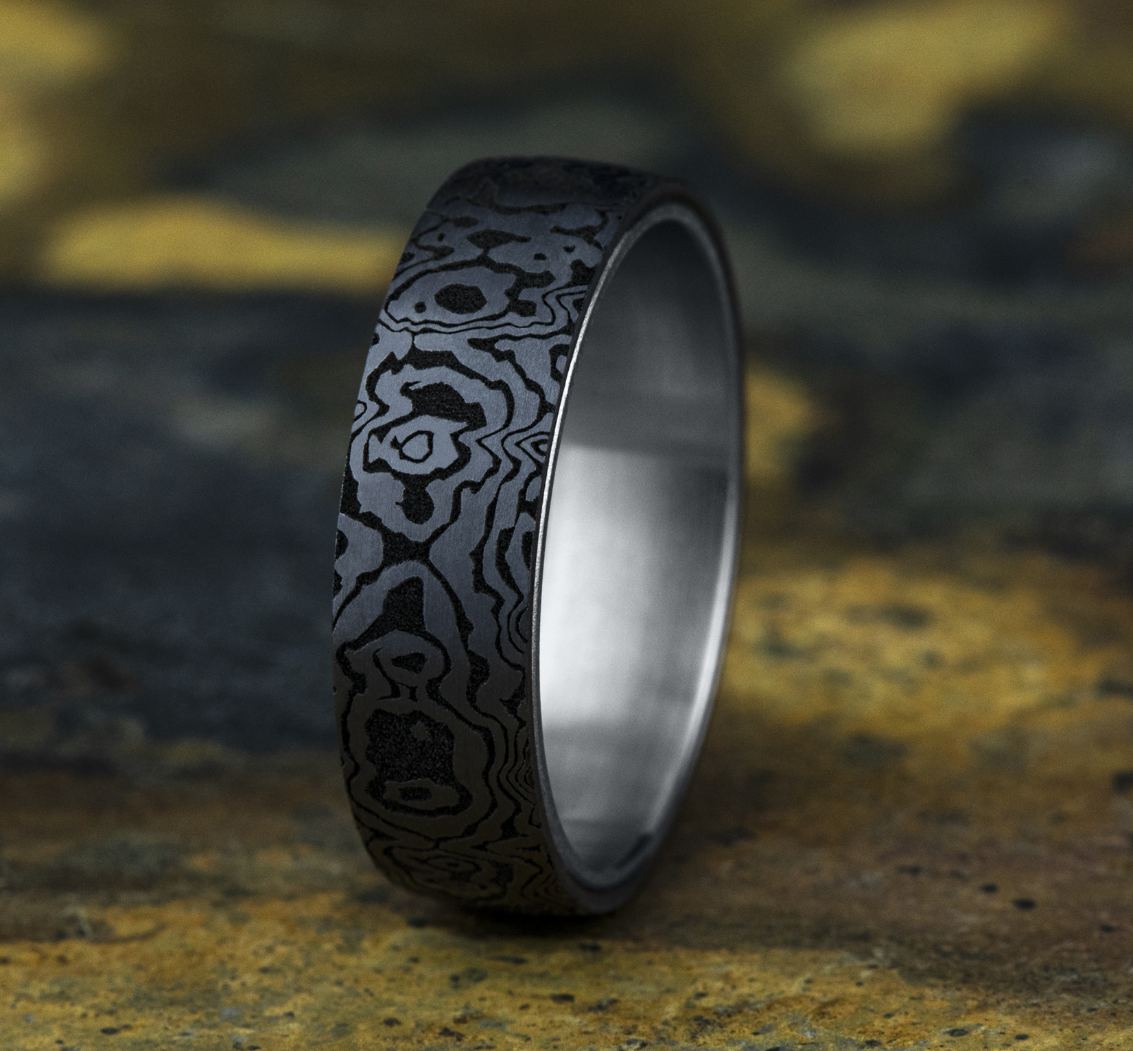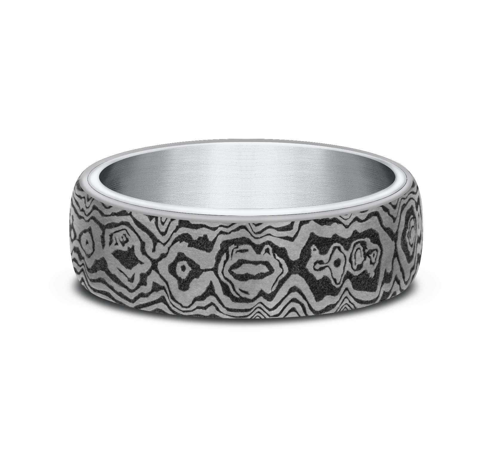 6.5mm, Comfort fit 14K White Gold and Grey Tantalum Unique Tamascus design