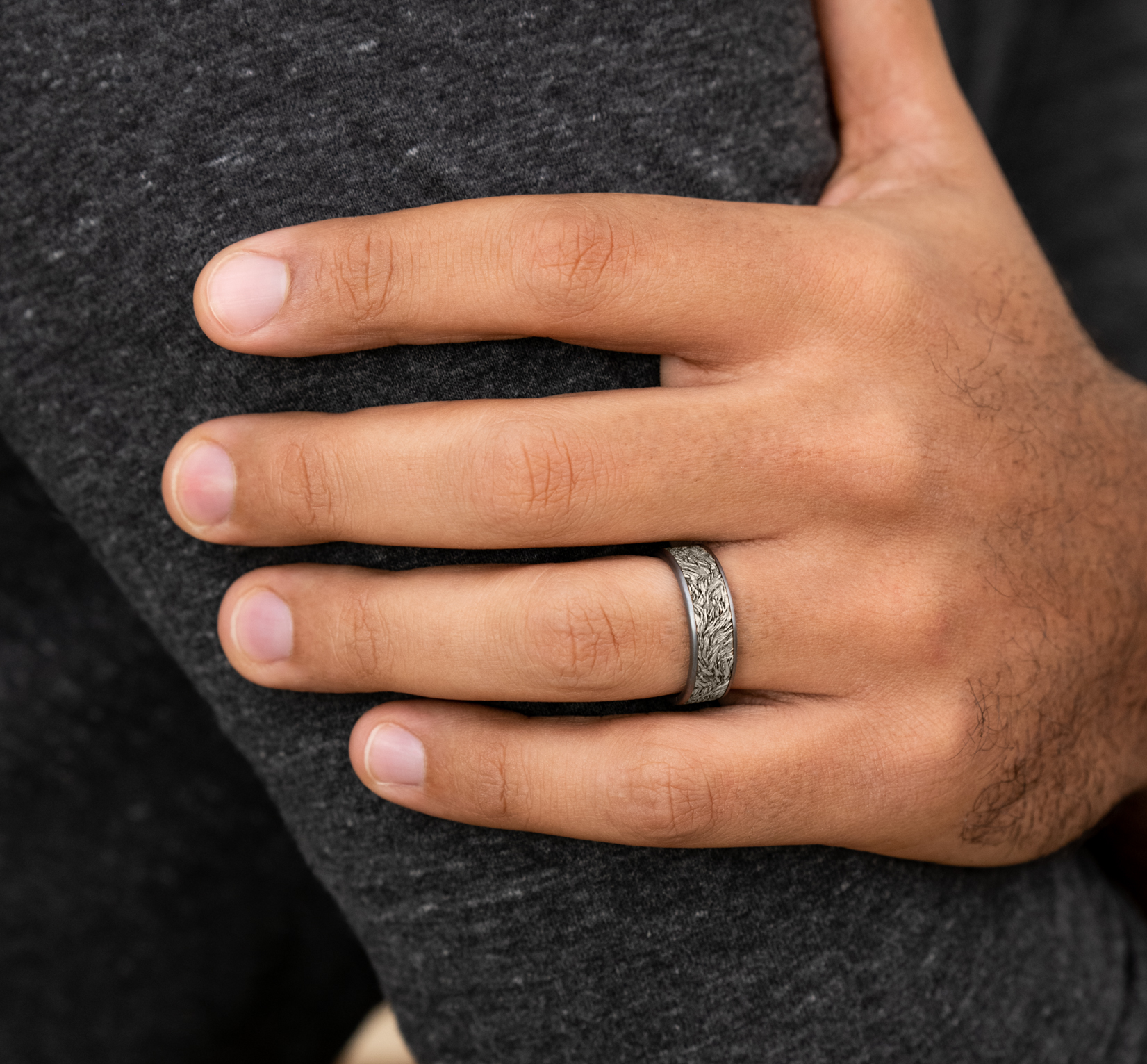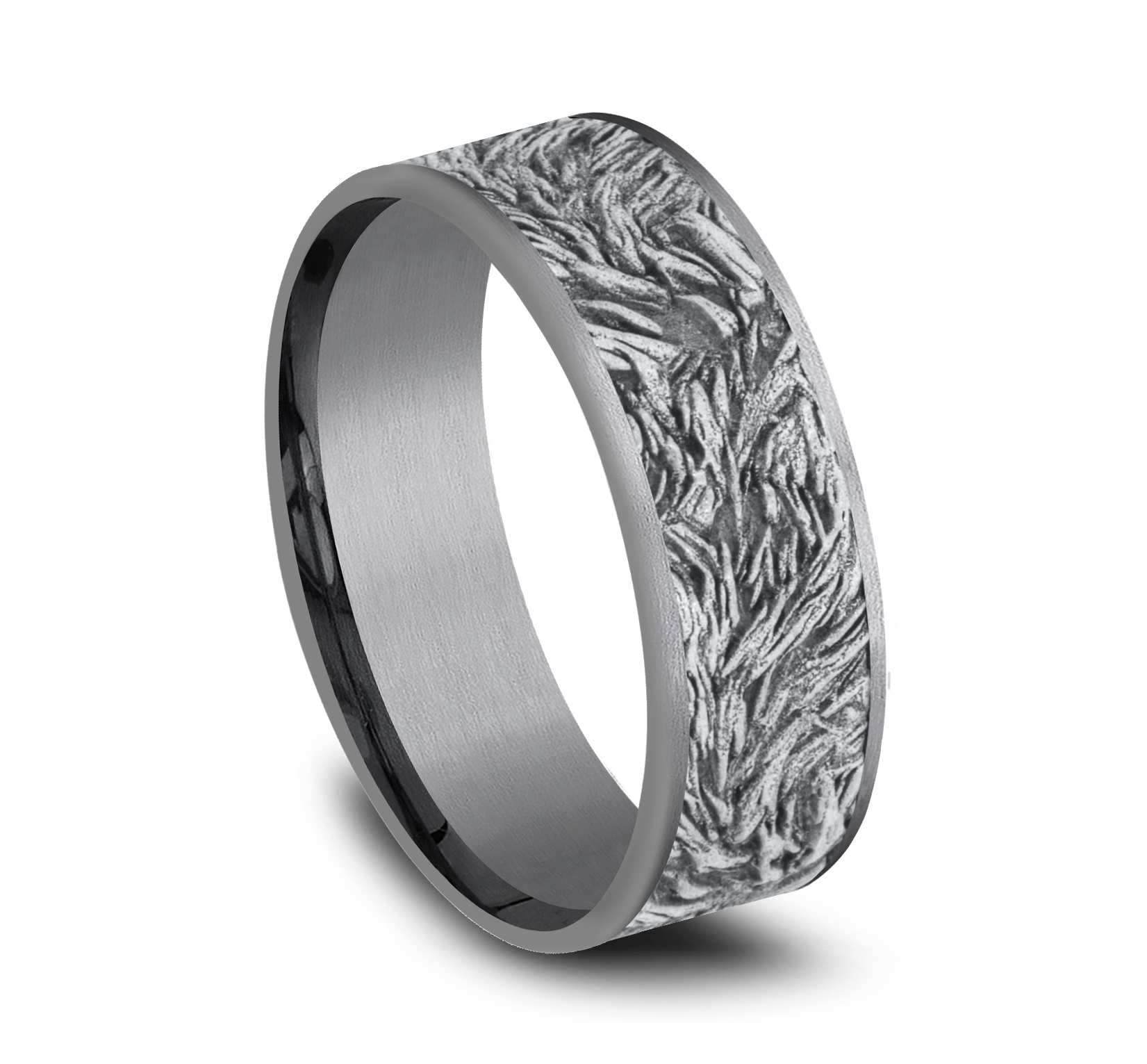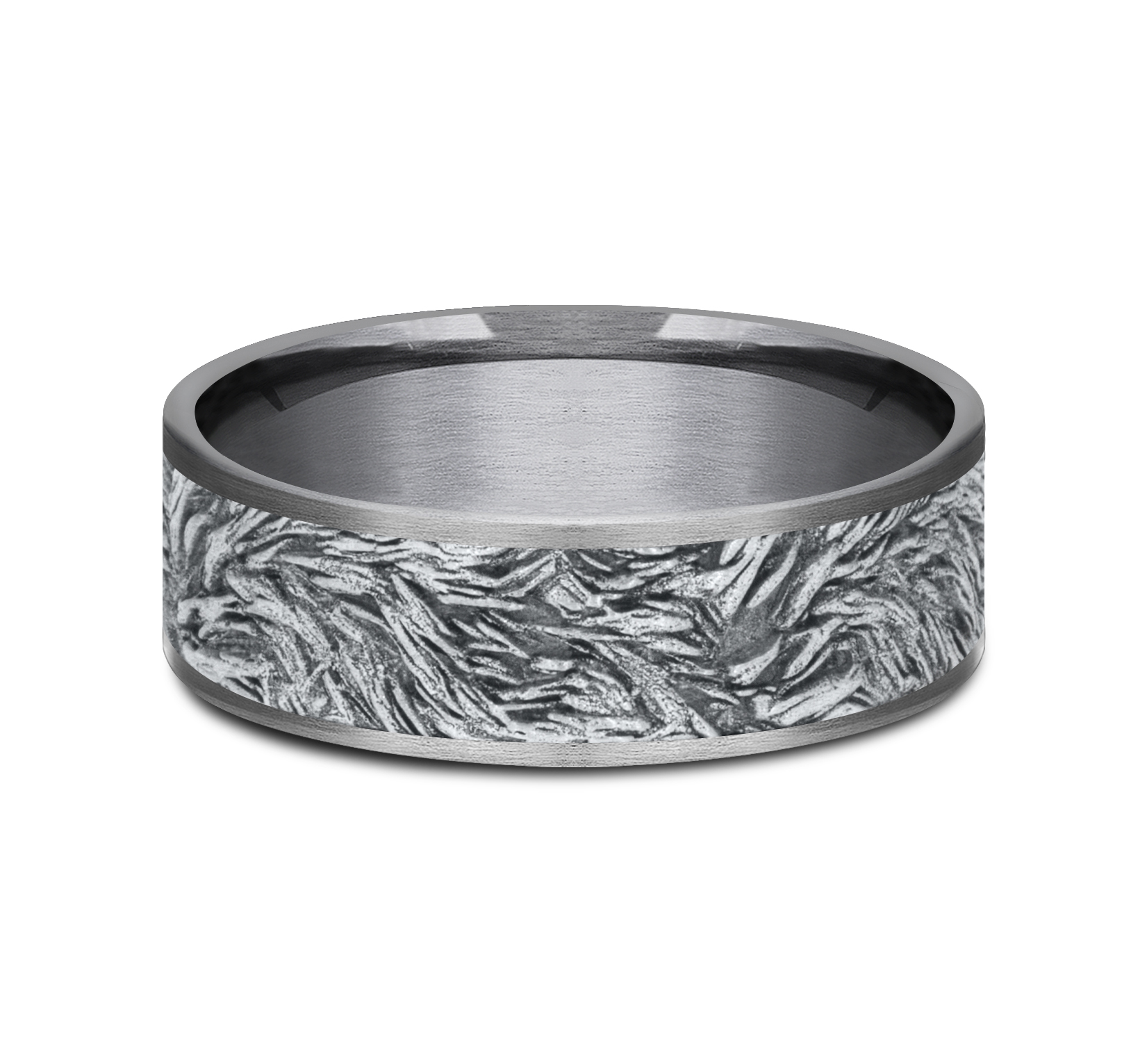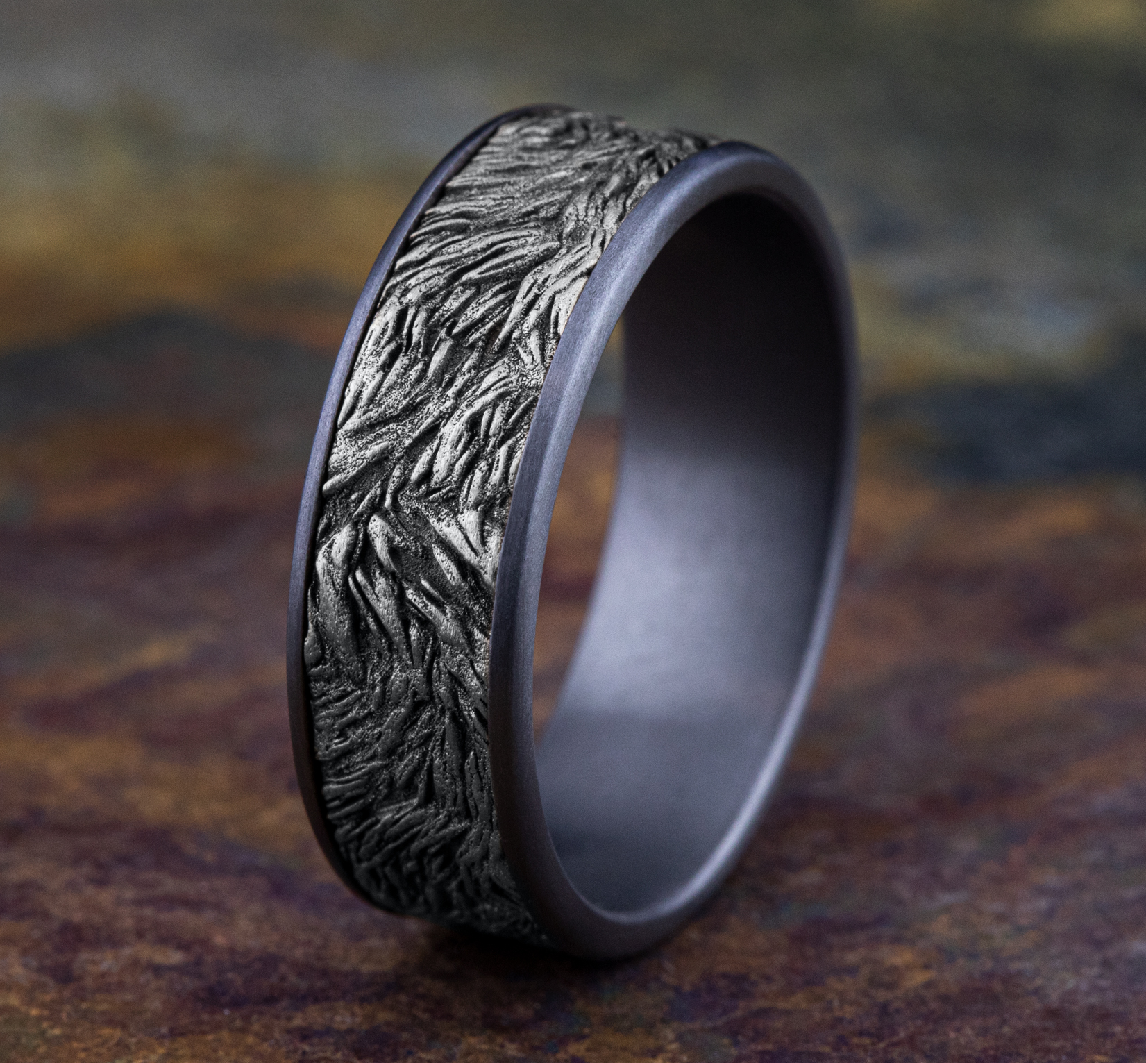 7.5mm, Comfort fit Grey Tantalum and 14K White Lions mane patterned center, thin edges