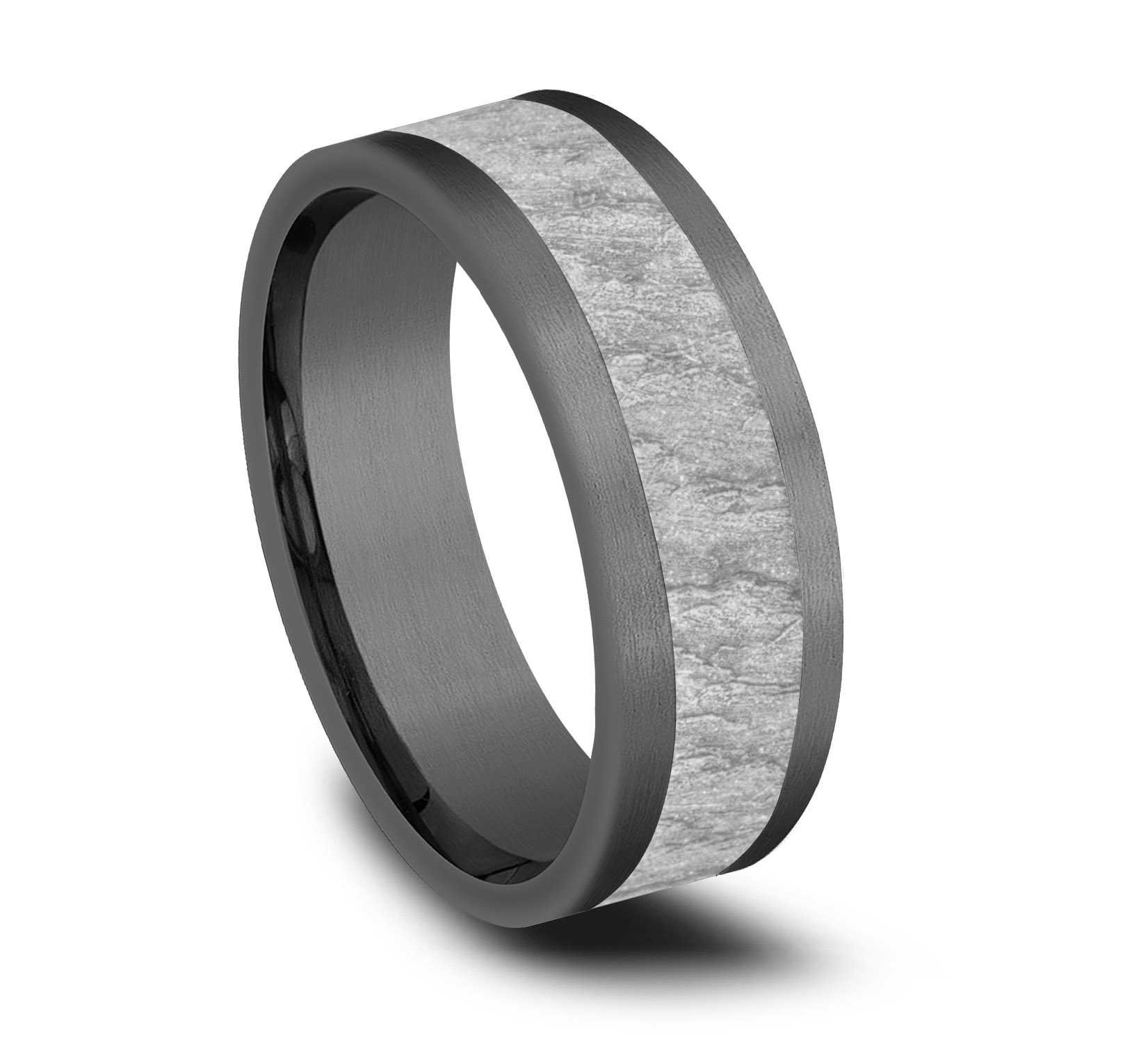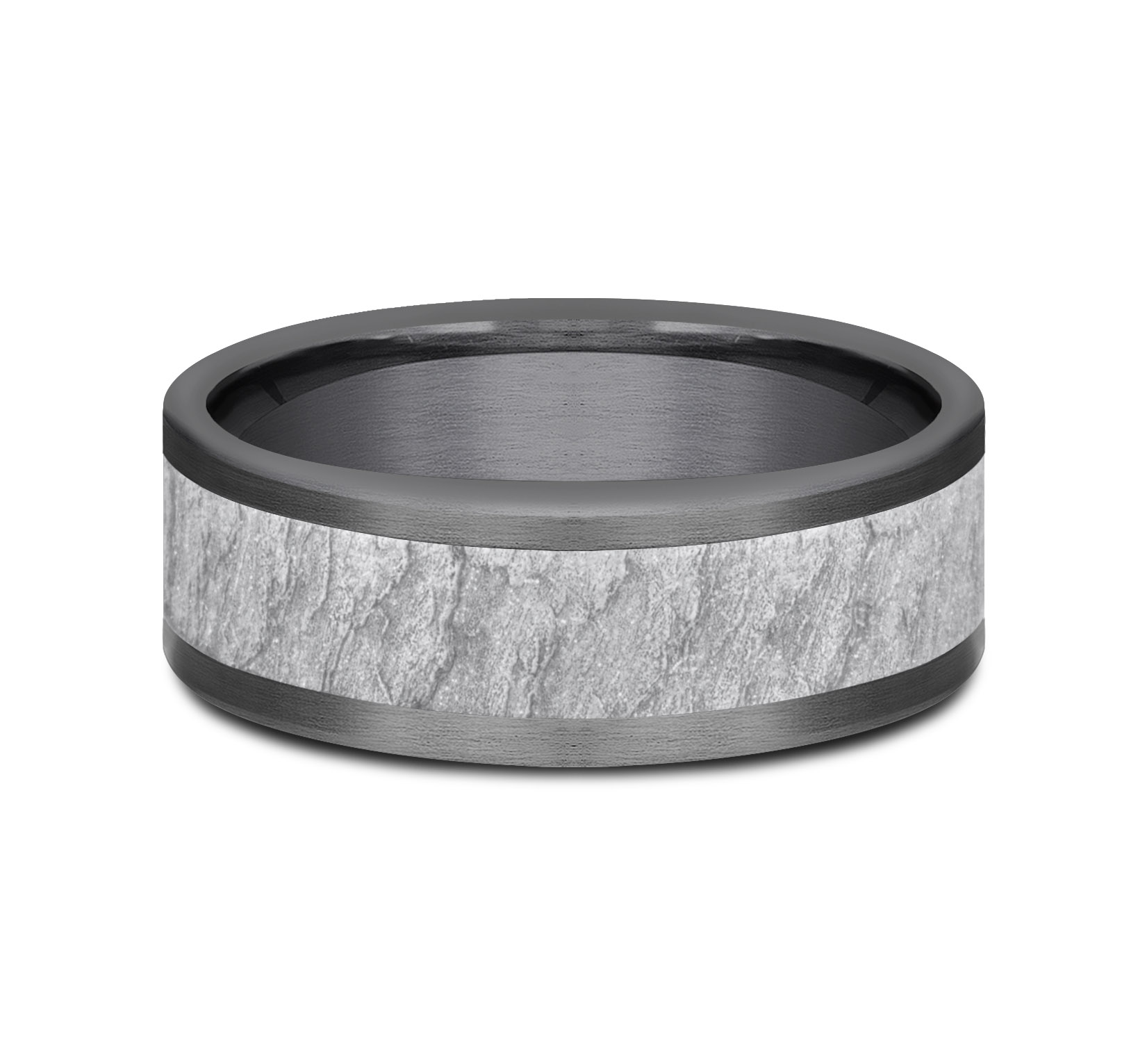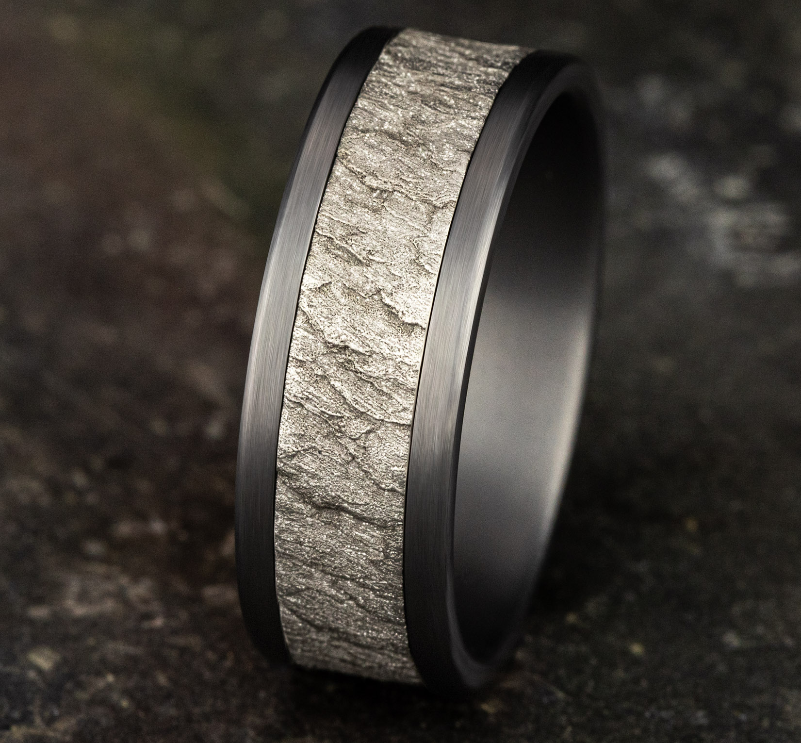 8mm, Comfort fit Grey Tantalum and 14K White Gold Lava rock textured center, straight edges