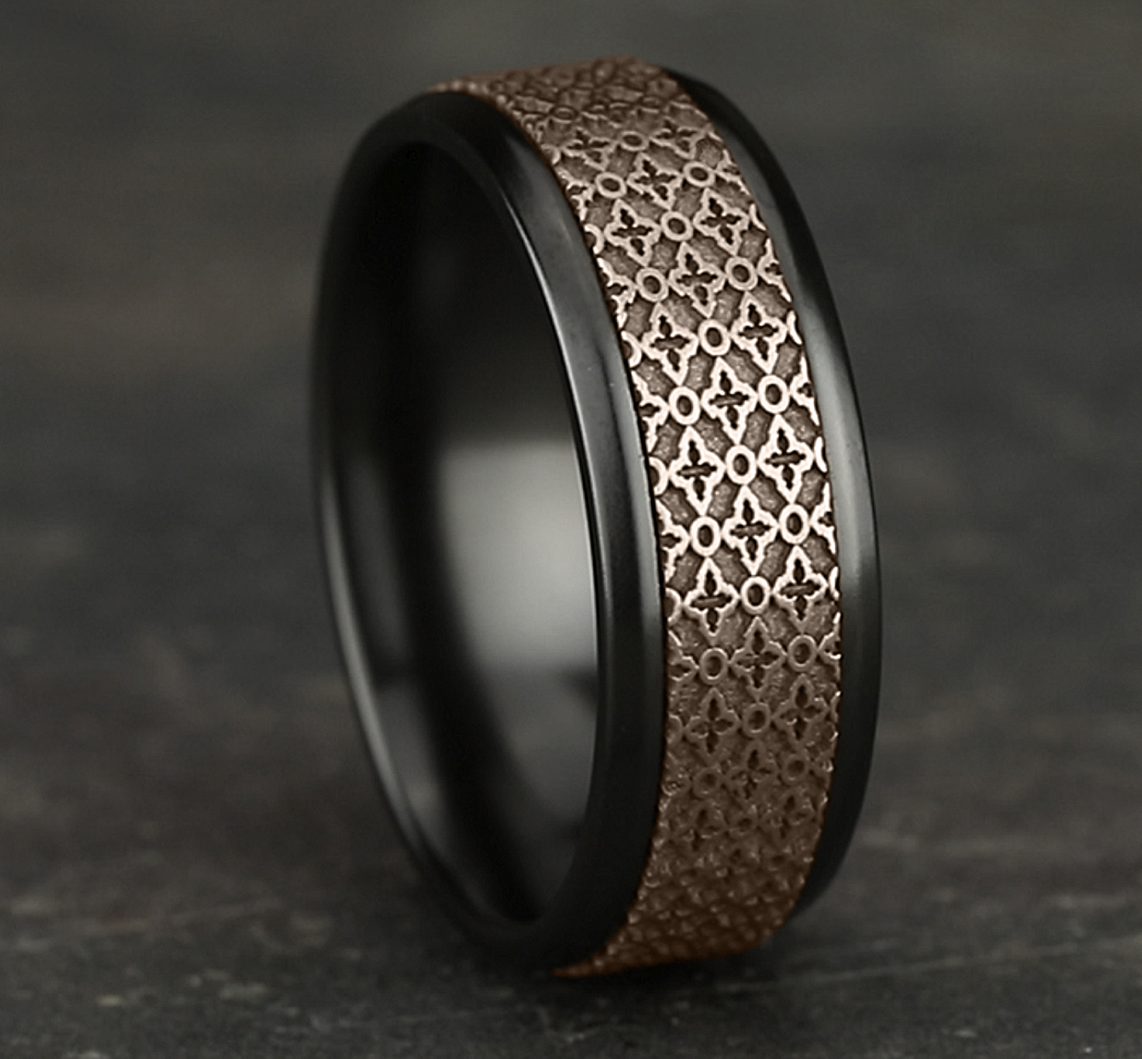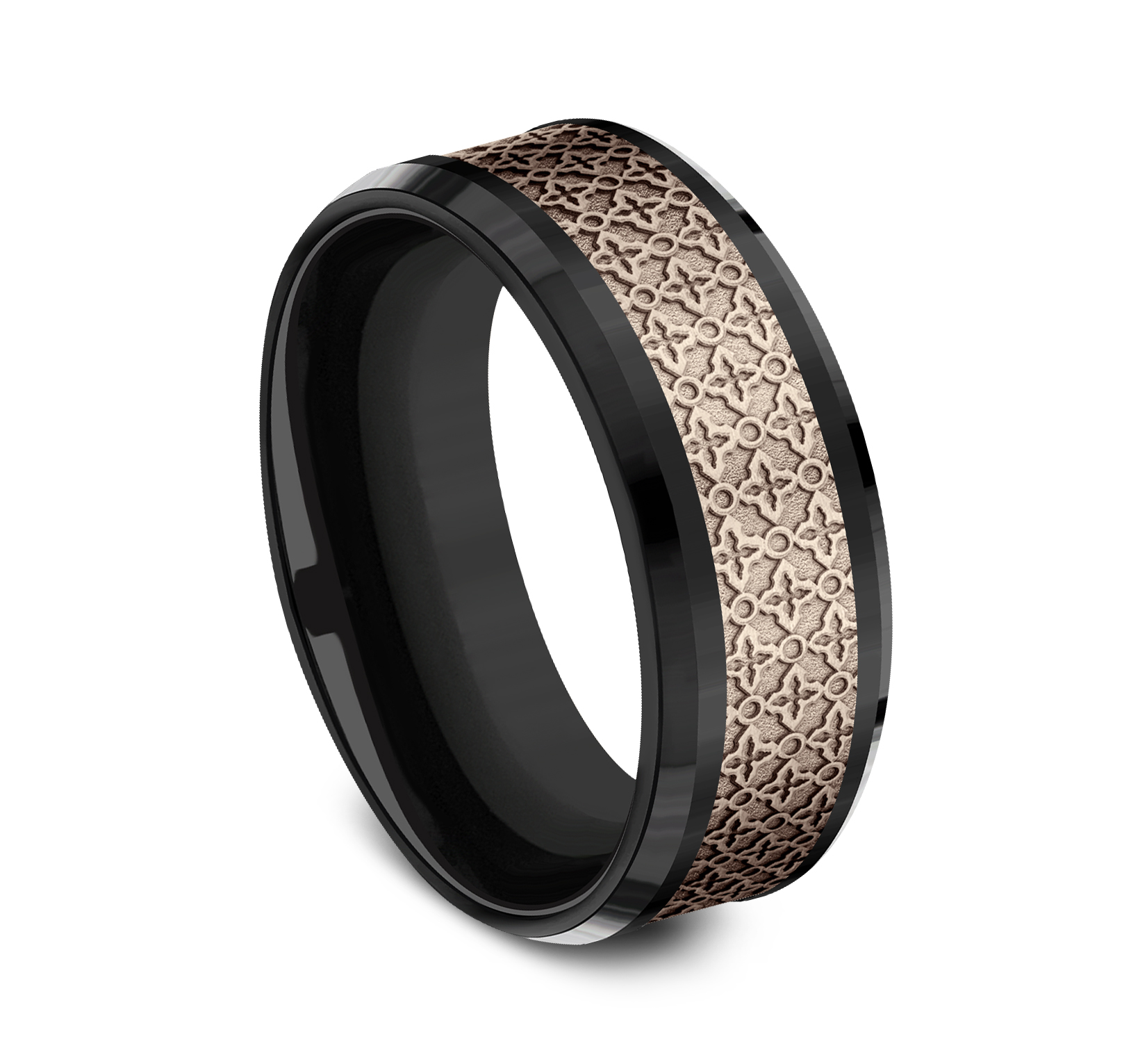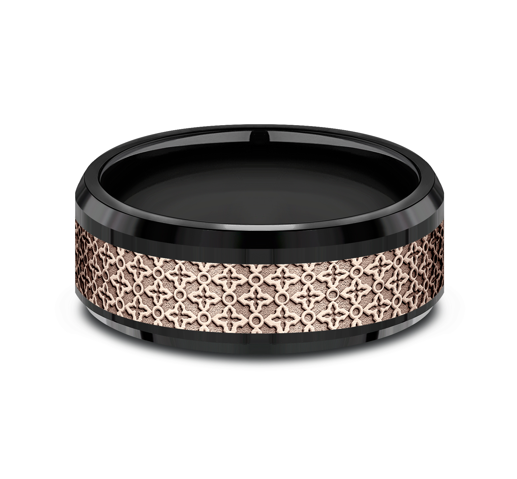 8mm, Comfort fit Black Titanium and 14K Rose Gold Ottoman floral pattern, polished bevel edges