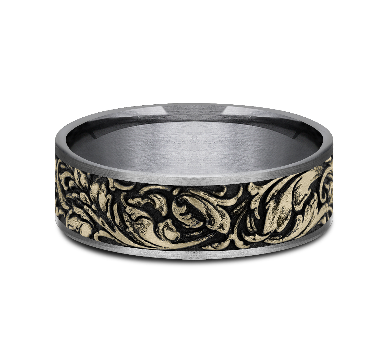 7.5mm, Comfort fit Grey Tantalum and 14K Yellow Gold Vine pattern, thin edges
