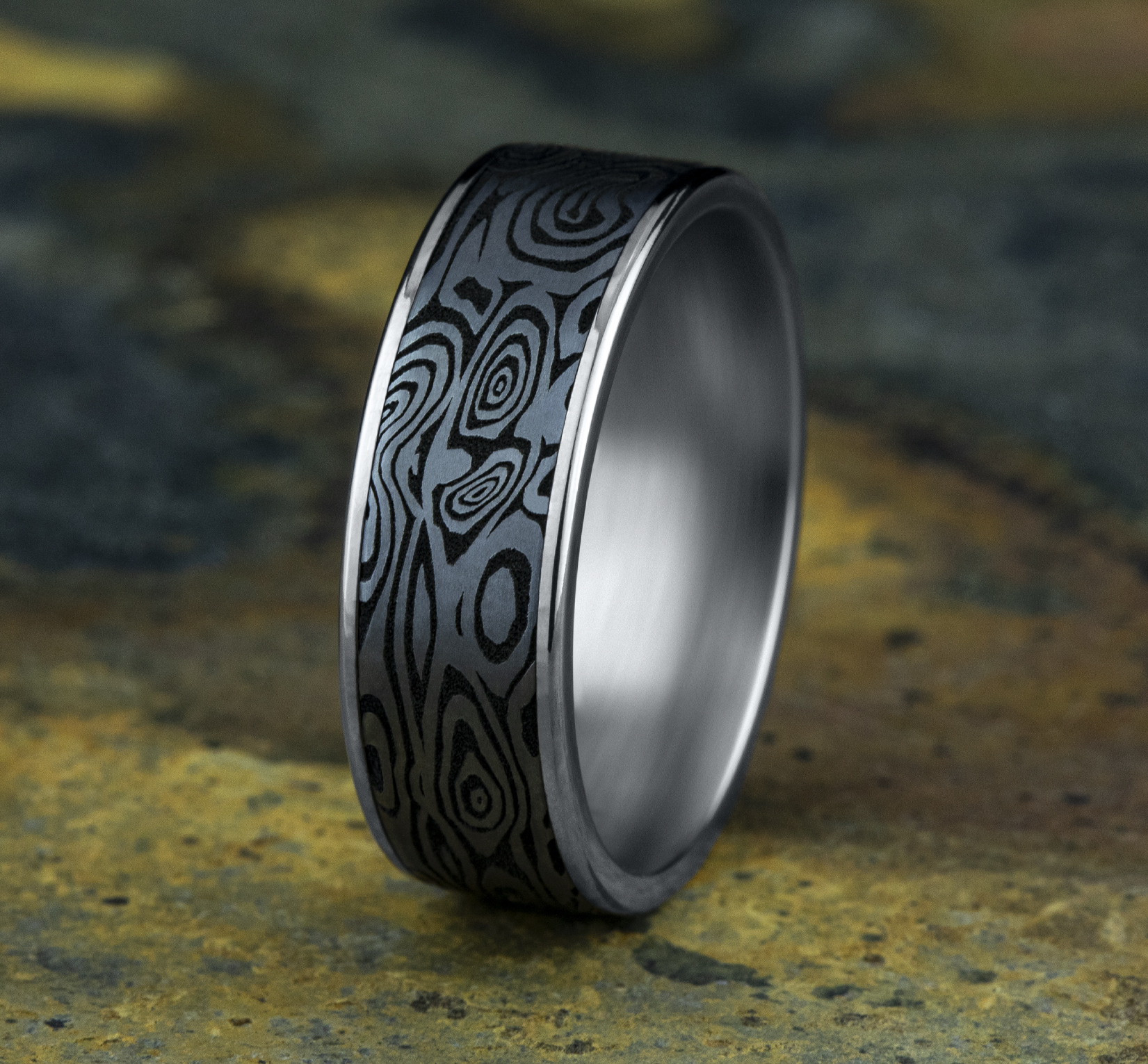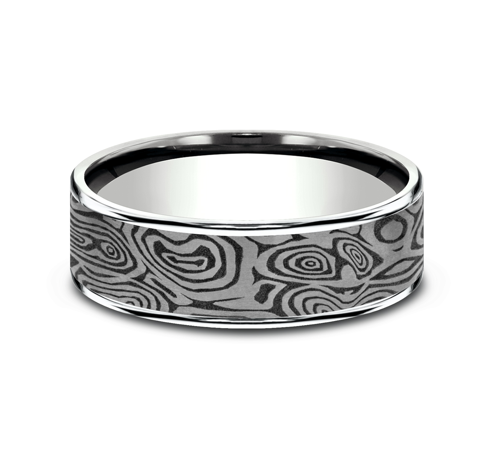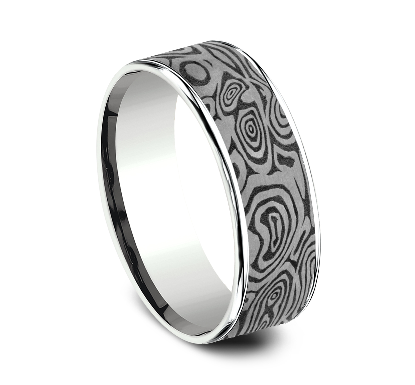 7.5mm, Comfort fit 14K White Gold and Grey Tantalum Unique Tamascus designed center, thin edges