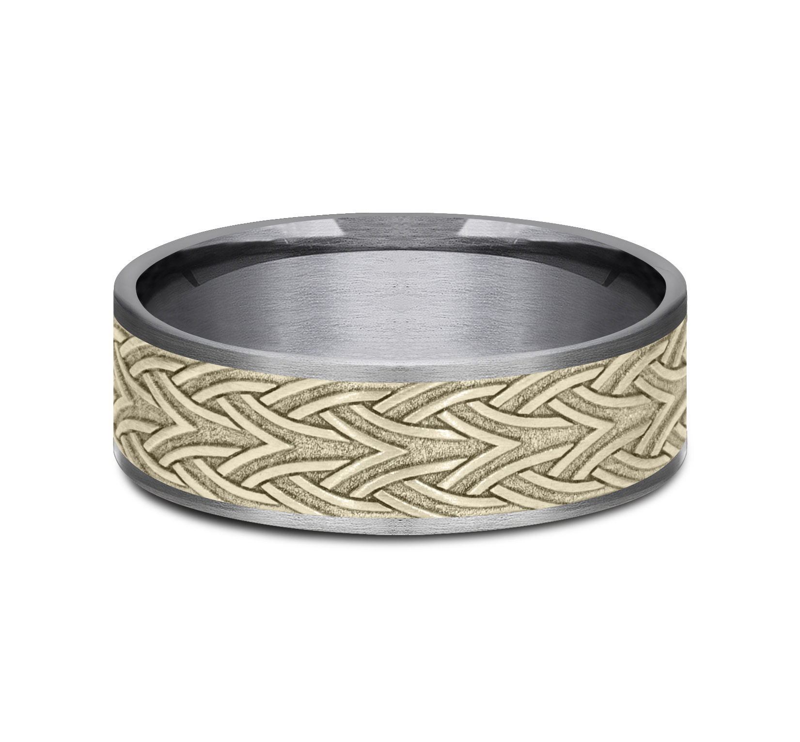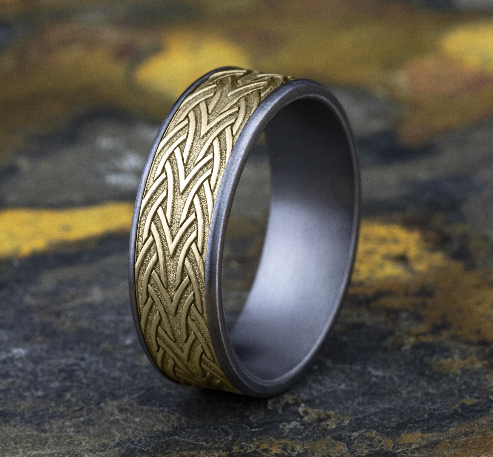7.5mm, Comfort fit Grey Tantalum and 14K Yellow Gold Celtic arrow knot designed center, thin edges