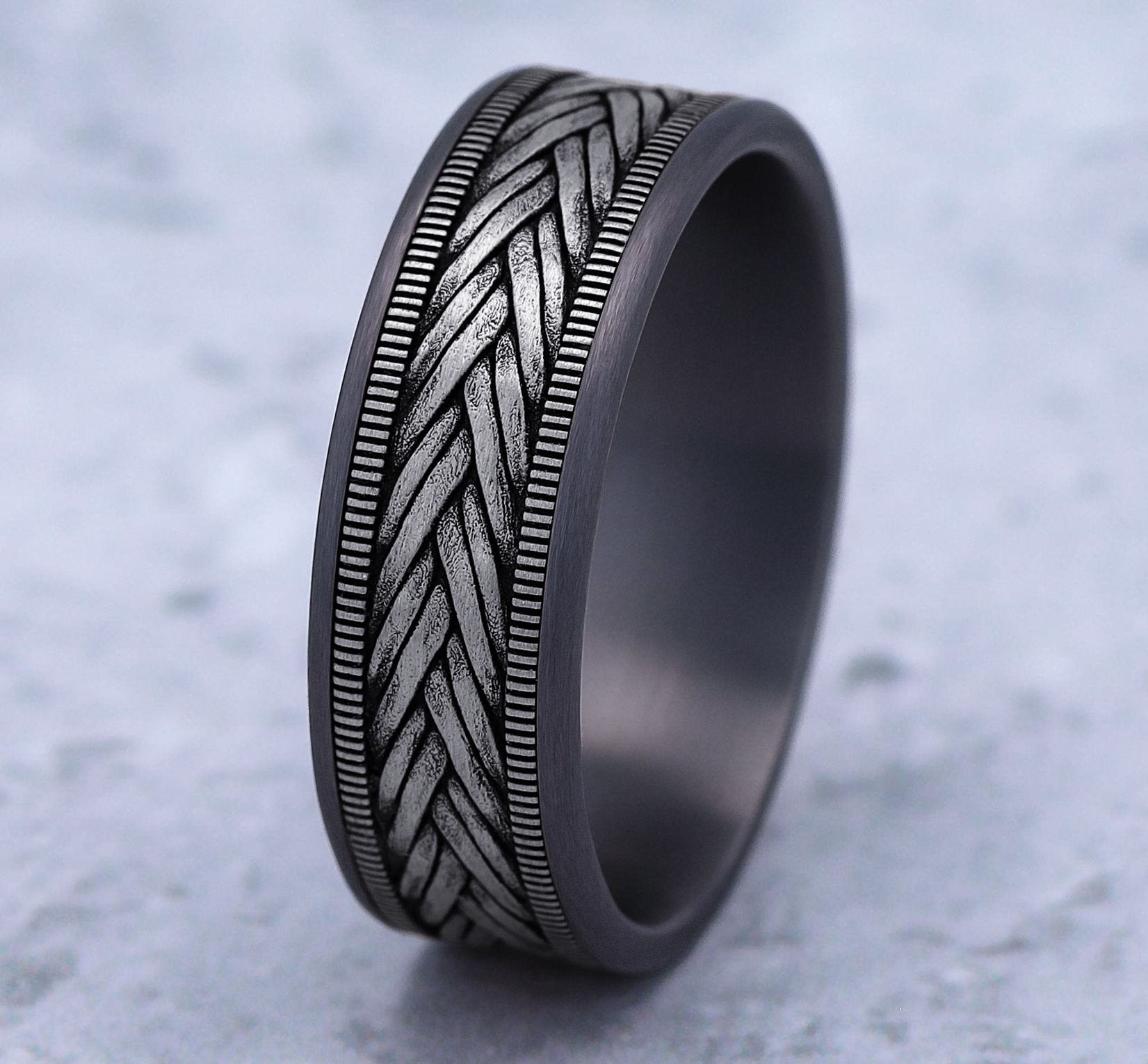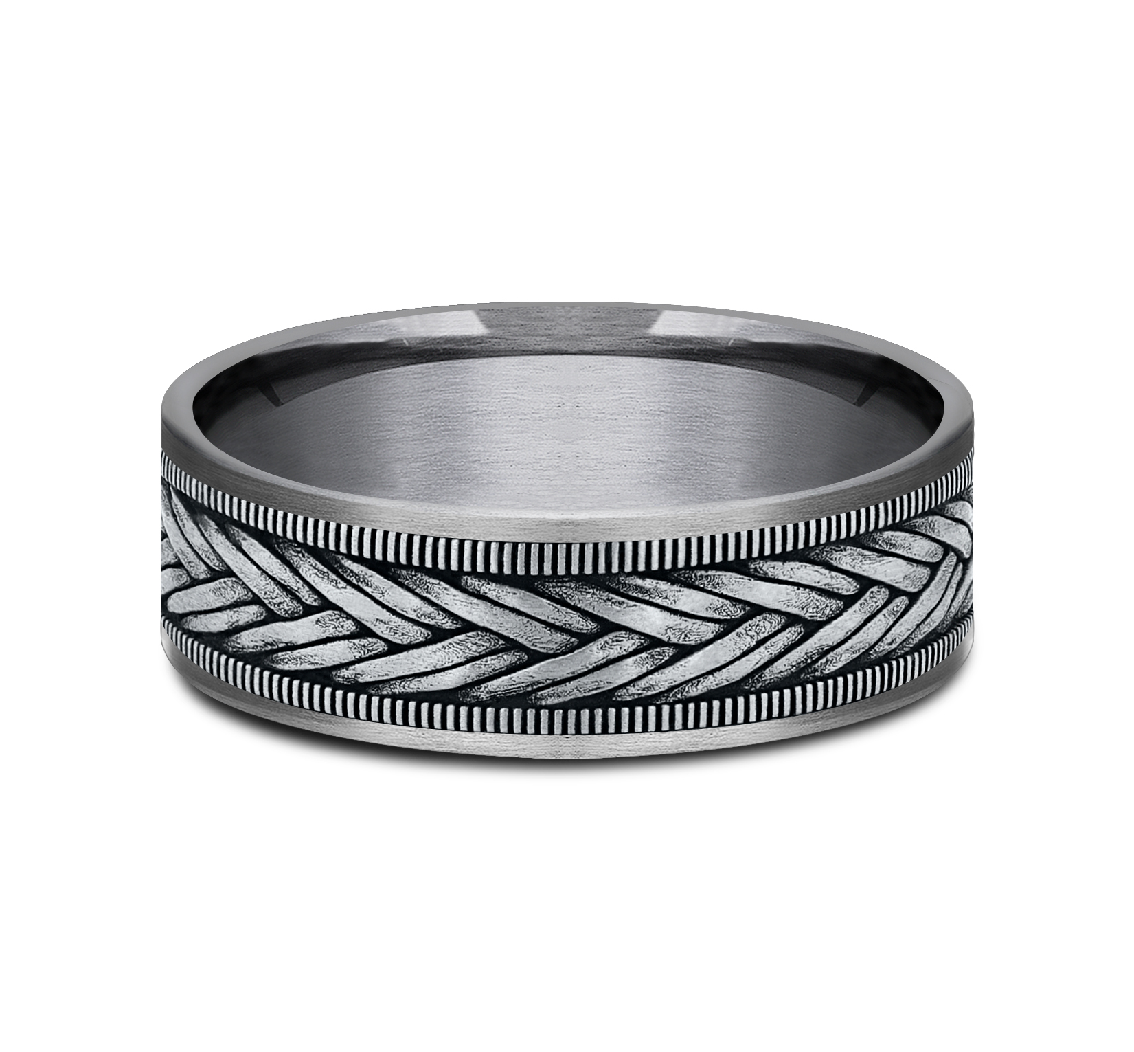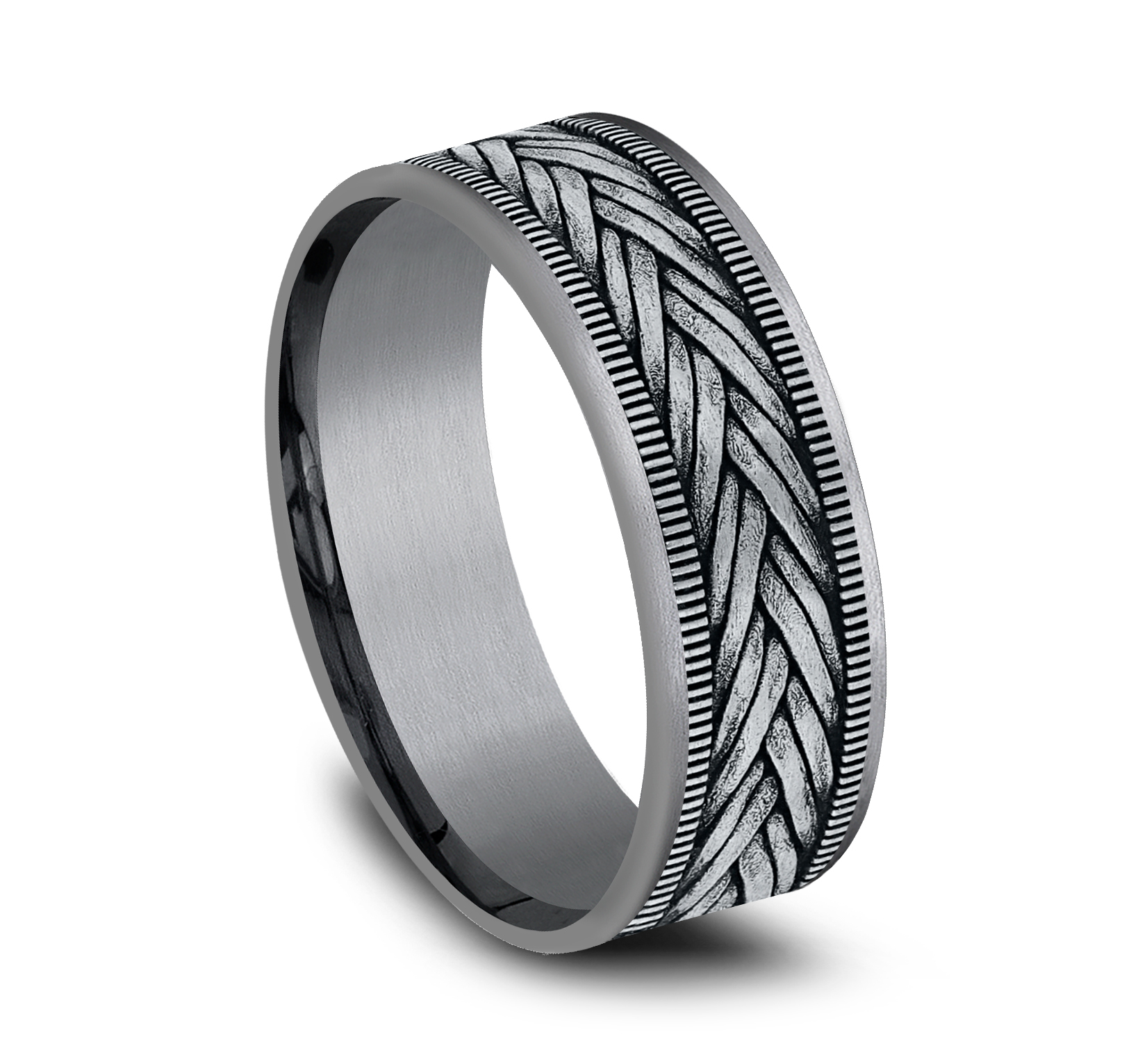 7.5mm, Comfort fit Grey Tantalum and 14K White Gold Wheat weave pattern, thin edges