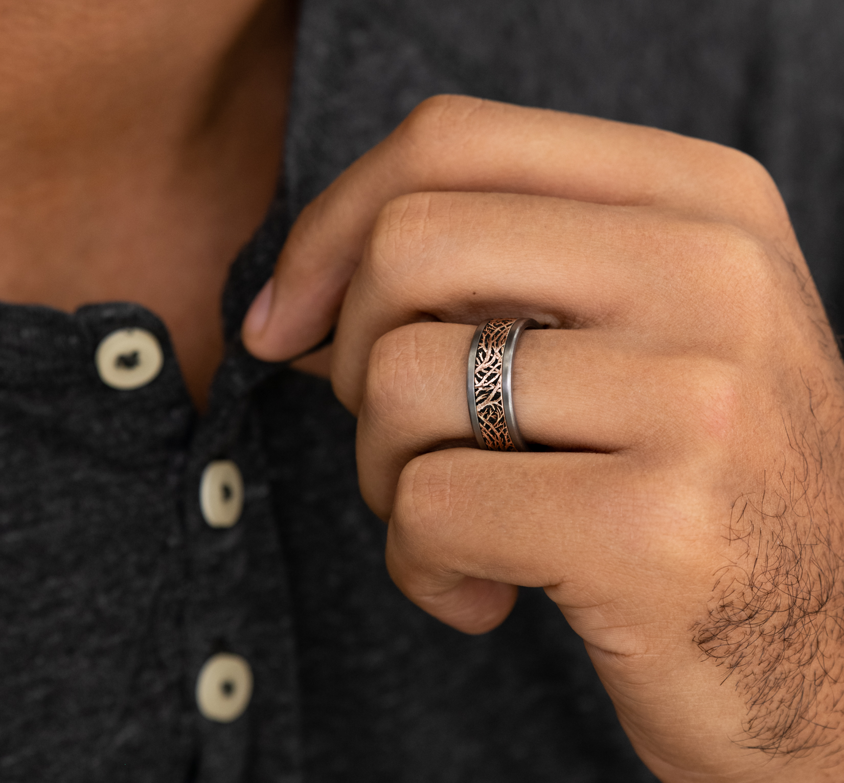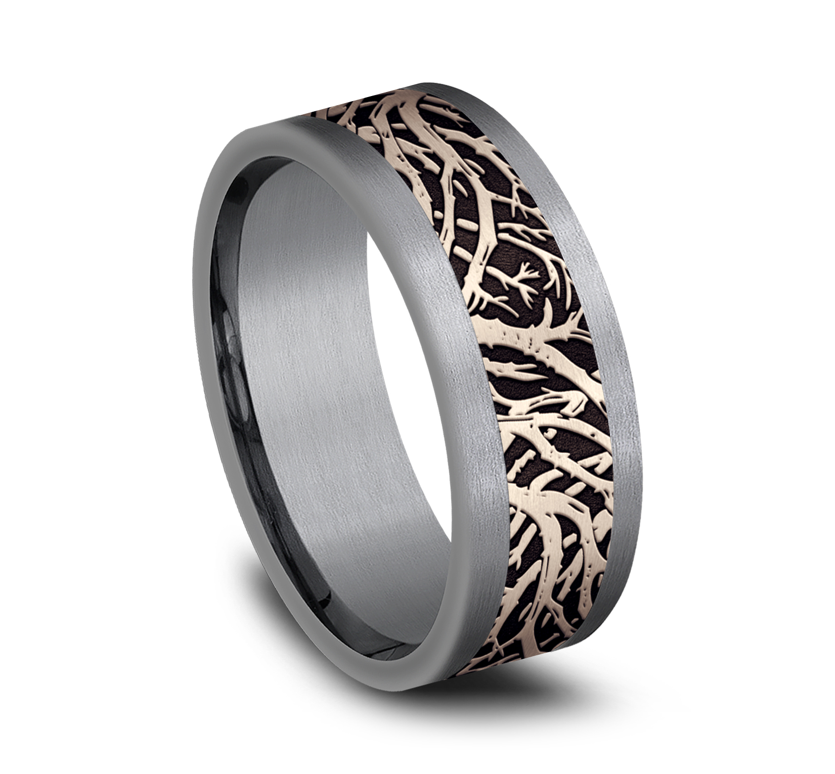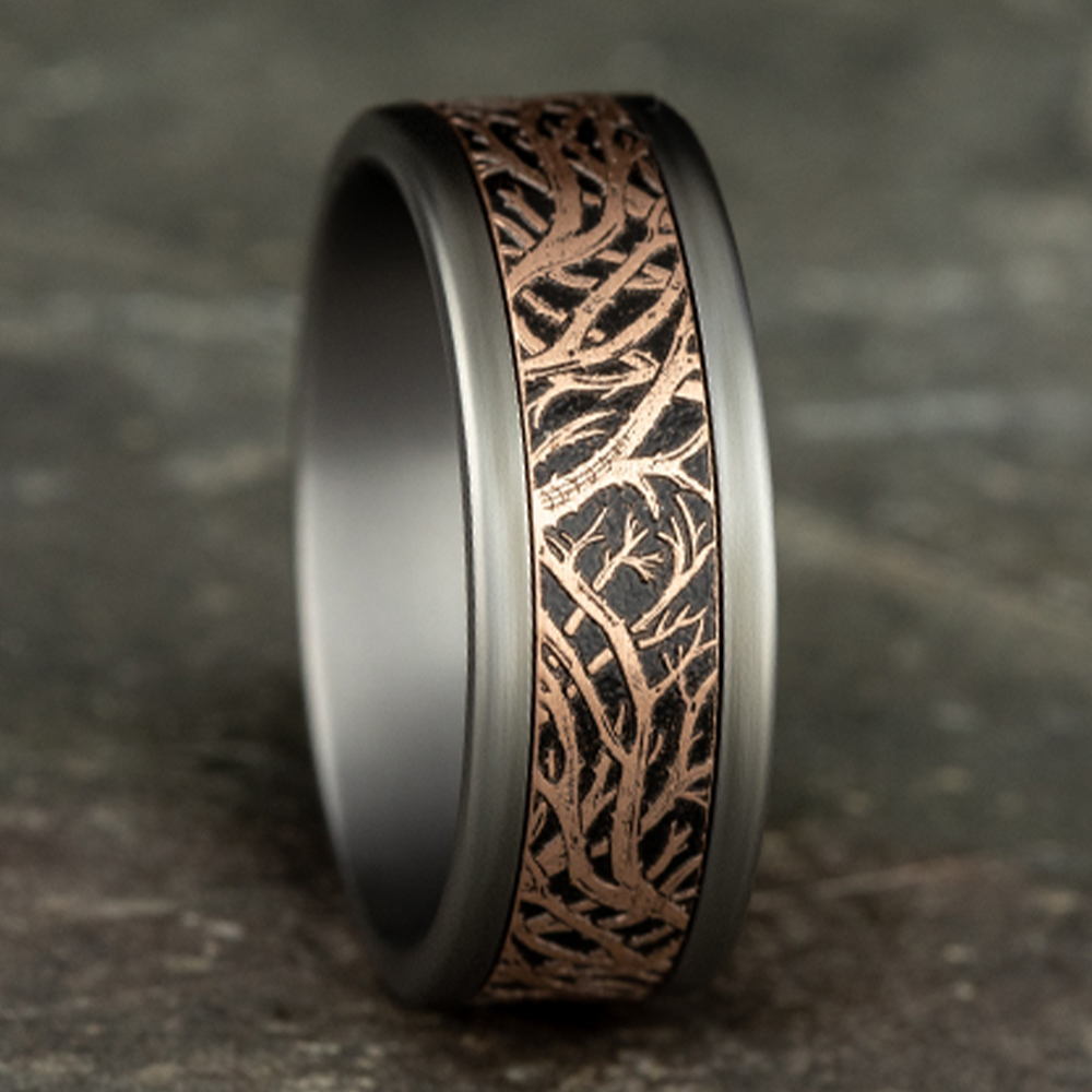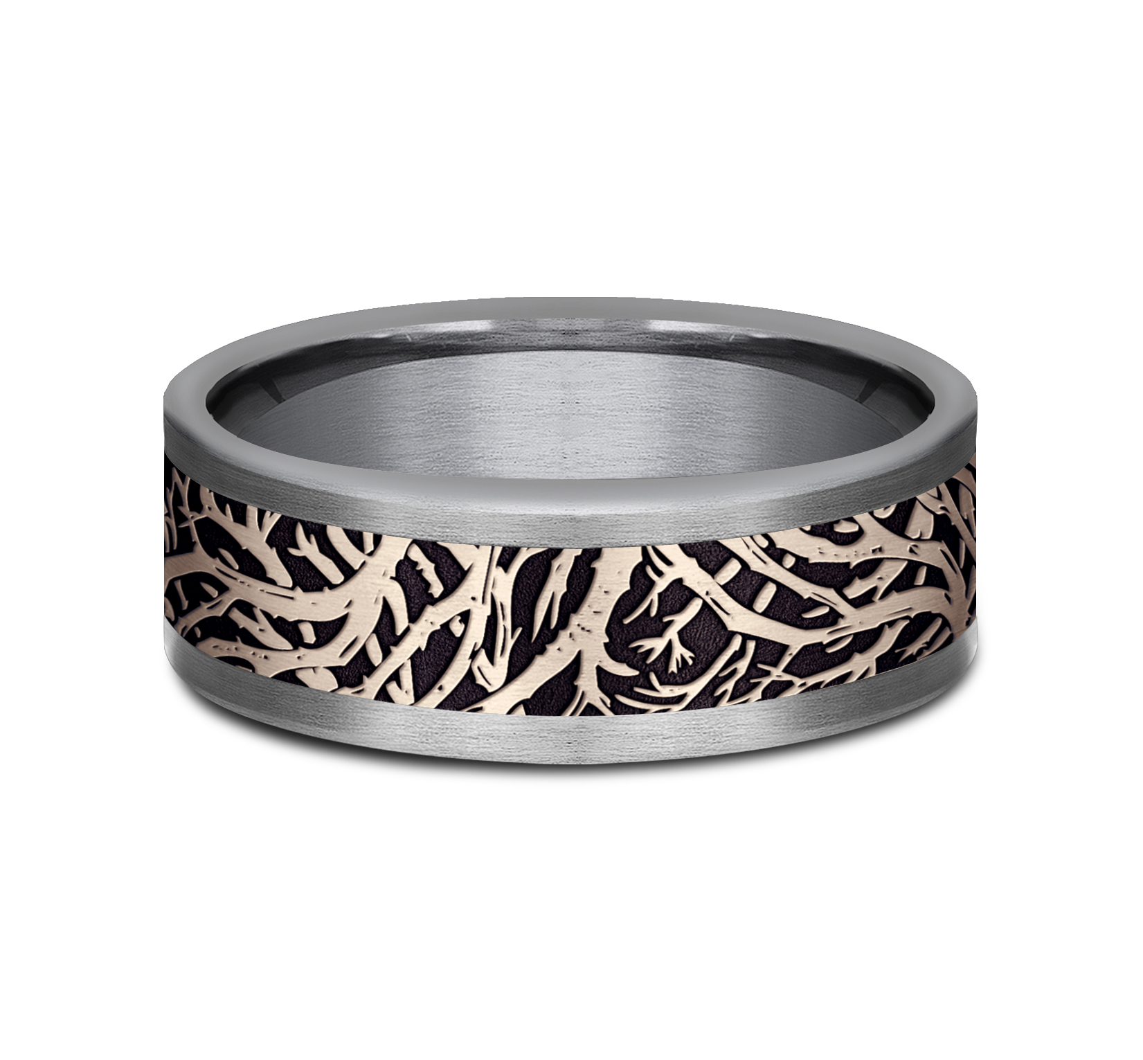 8mm, Comfort fit Grey Tantalum and 14K Rose Gold Forest branch pattern, straight edges
